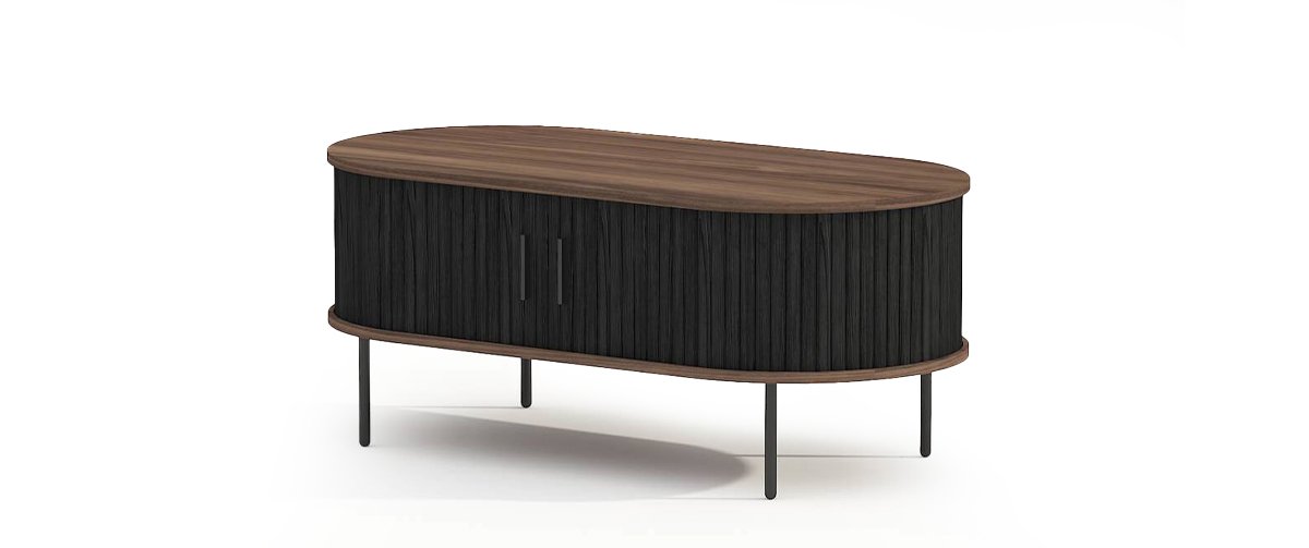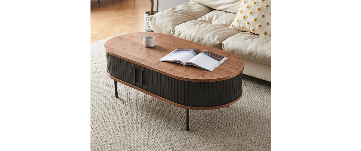 Το τραπεζάκι σαλονιού Harlem διαθέτει συρόμενα πλαϊνά συρτάρια, κατασκευασμένο από ανθεκτική μελαμίνη σε καρυδί χρώμα που συνδυάζει λειτουργικότητα και στυλ.