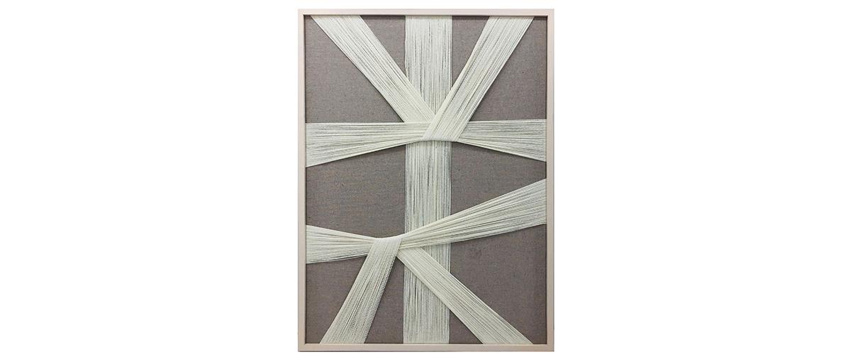 Οι υφαντές λουρίδες που διασταυρώνονται δημιουργούν ένα εντυπωσιακό παιχνίδι γραμμών και σκιάς, προσφέροντας βάθος και χαρακτήρα.