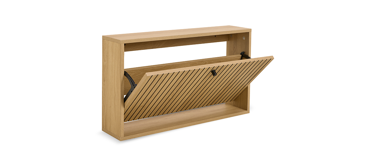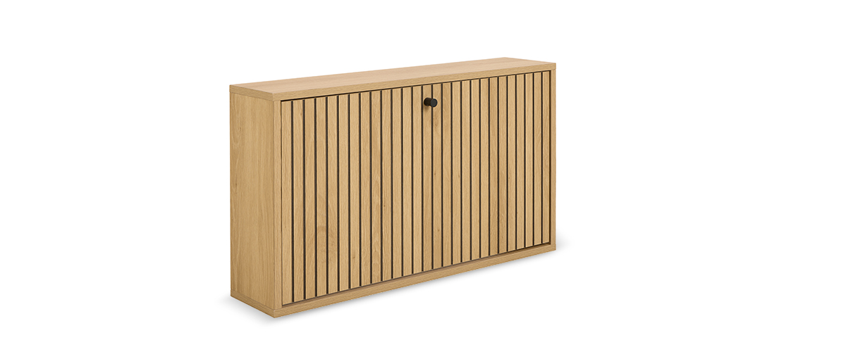 Με φυσική απόχρωση δρυς και πρόσοψη τύπου Lamella, αυτή η παπουτσοθήκη προσθέτει στυλ και πρακτικότητα στο χολ σας.