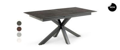 The rectangular Heaven extendable dining table with a ceramic surface with a rough texture and a black steel cross base,