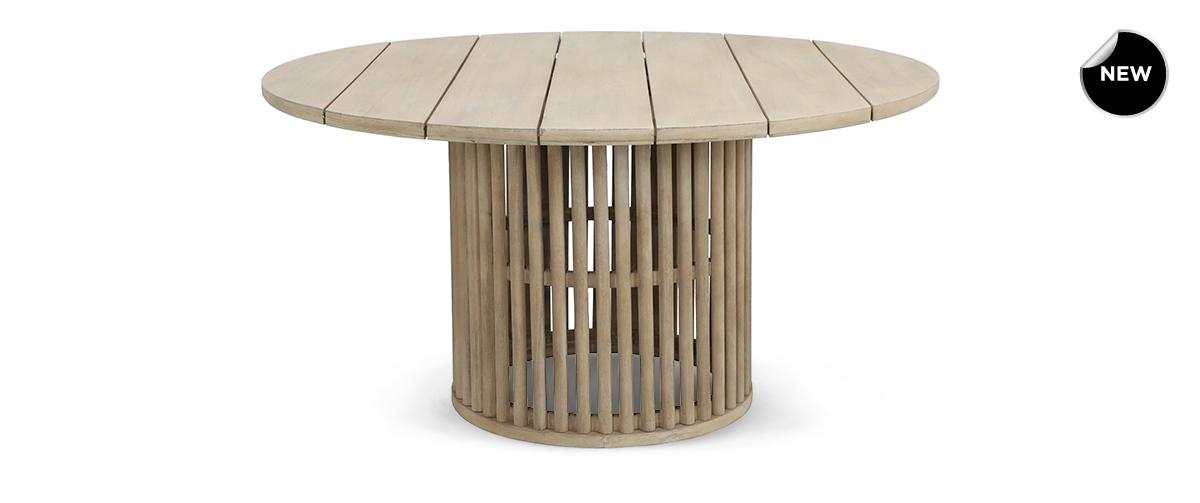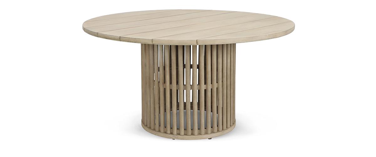 Κατασκευασμένο από ξύλο ακακίας σε natural απόχρωση, διαθέτει κυκλική επιφάνεια και στιβαρή βάση από κάθετες ξύλινες ράβδους, δημιουργώντας ένα εντυπωσιακό geometric statement που τραβά το βλέμμα με διακριτική αλλά δυναμική παρουσία.