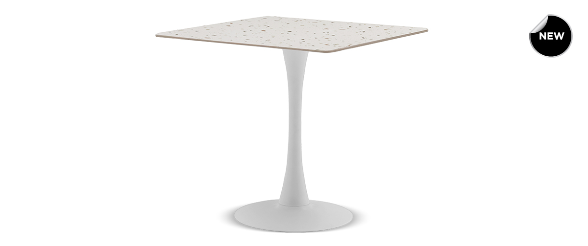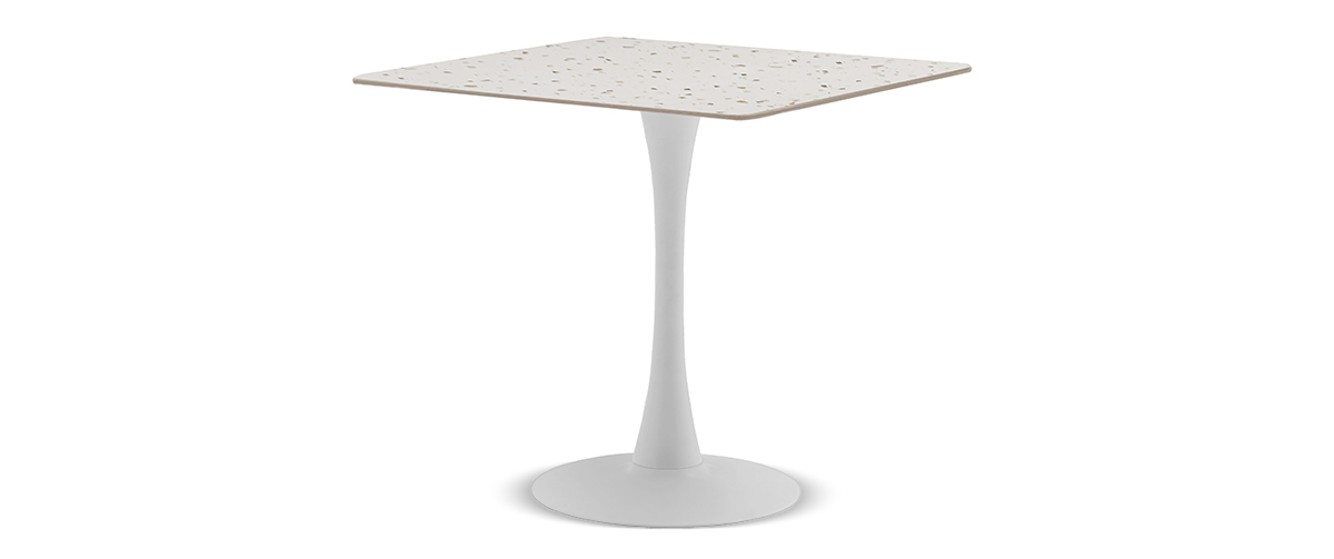 Η επιφάνεια από τεχνητή πέτρα terrazzo σε λευκές αποχρώσεις και ο κομψός μεταλλικός σκελετός δημιουργούν μια modern yet timeless ατμόσφαιρα, ιδανική για τραπεζαρίες, κουζίνες ή σύγχρονους επαγγελματικούς χώρους.