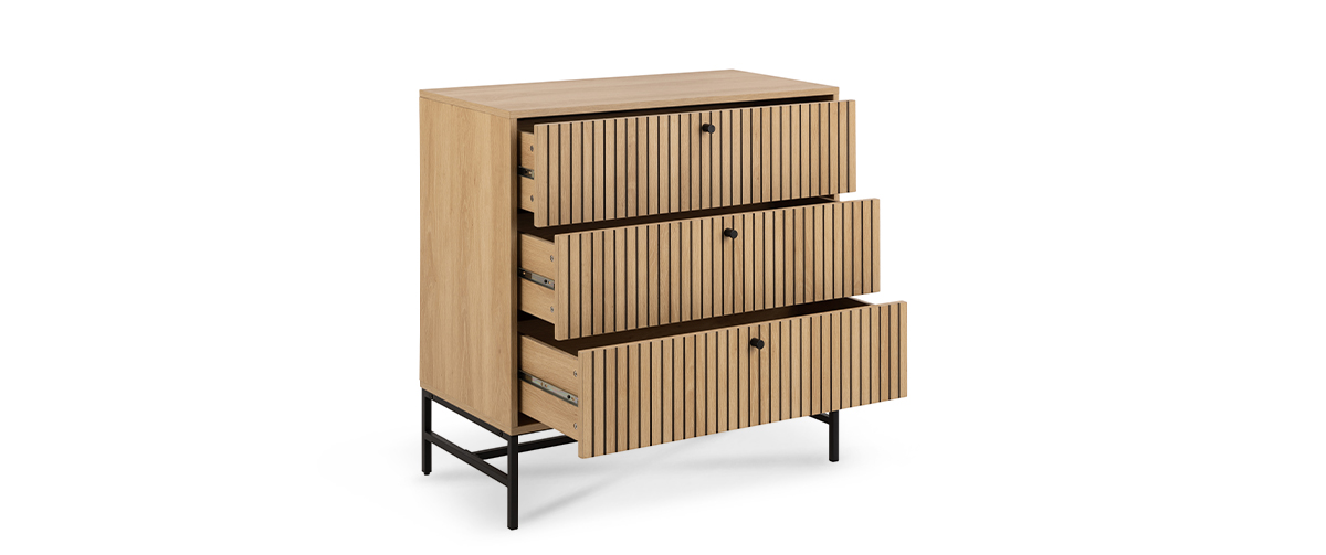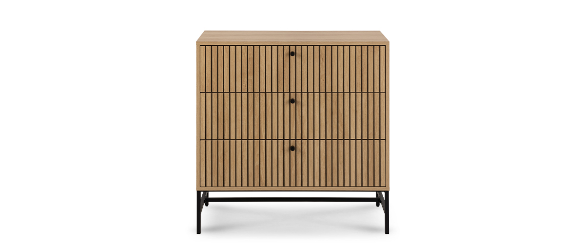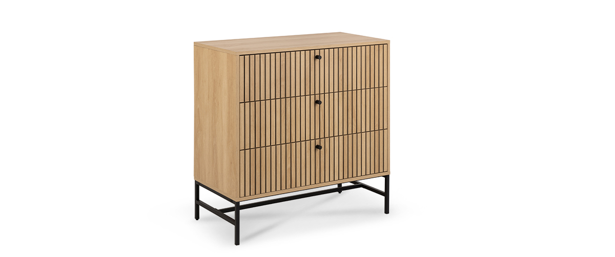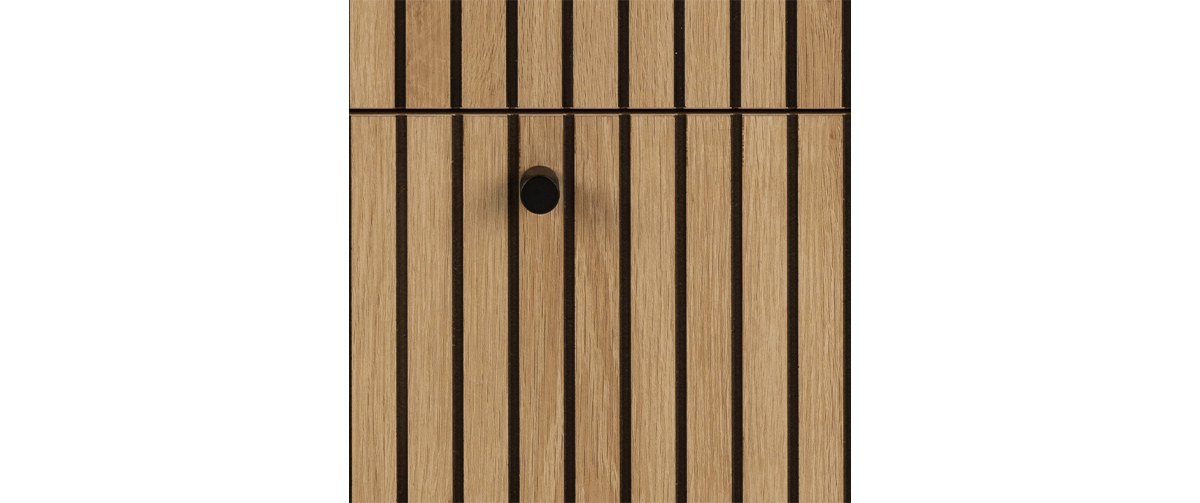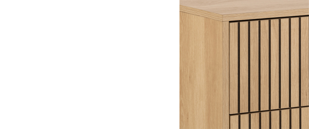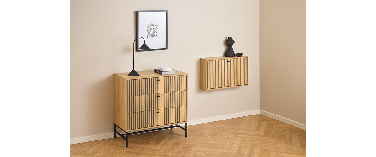Με φυσική απόχρωση δρυς και πρόσοψη τύπου Lamella, αυτή η συρταριέρα τραβά αμέσως τα βλέμματα.