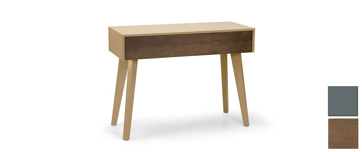 Η κονσόλα SANTO είναι με λακαριστές επιφάνειες και πόδια, καθώς και με μετώπη από φυσικό ξύλο καπλαμά. Το συρτάρι έχει αναβαθμισμένους οδηγούς με φρένο. Συνδυάζεται με το κομοδίνο Santo.