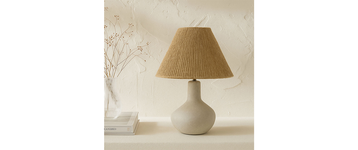 Η βάση του θυμίζει πέτρα με λευκή απόχρωση, προσφέροντας στιβαρότητα και φυσική υφή, ενώ το καπέλο από μπεζ σχοινί δημιουργεί ζεστό, διάχυτο φως με οργανική αισθητική.