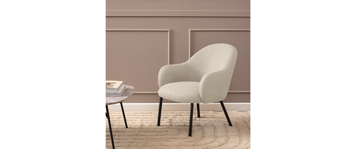 Η πολυθρόνα Spencer ξεχωρίζει με τη στρογγυλεμένη, κομψή σιλουέτα της και προσφέρει άνεση και στυλ σε κάθε χώρο lounge. Η επένδυση σε δομημένο ύφασμα ανοιχτό γκρι-καφέ με διχρωμία προσδίδει βάθος και υφή, ενώ τα στρογγυλά μαύρα μεταλλικά πόδια με ματ επίστρωση πούδρας εξασφαλίζουν σταθερότητα και διαχρονική αισθητική.