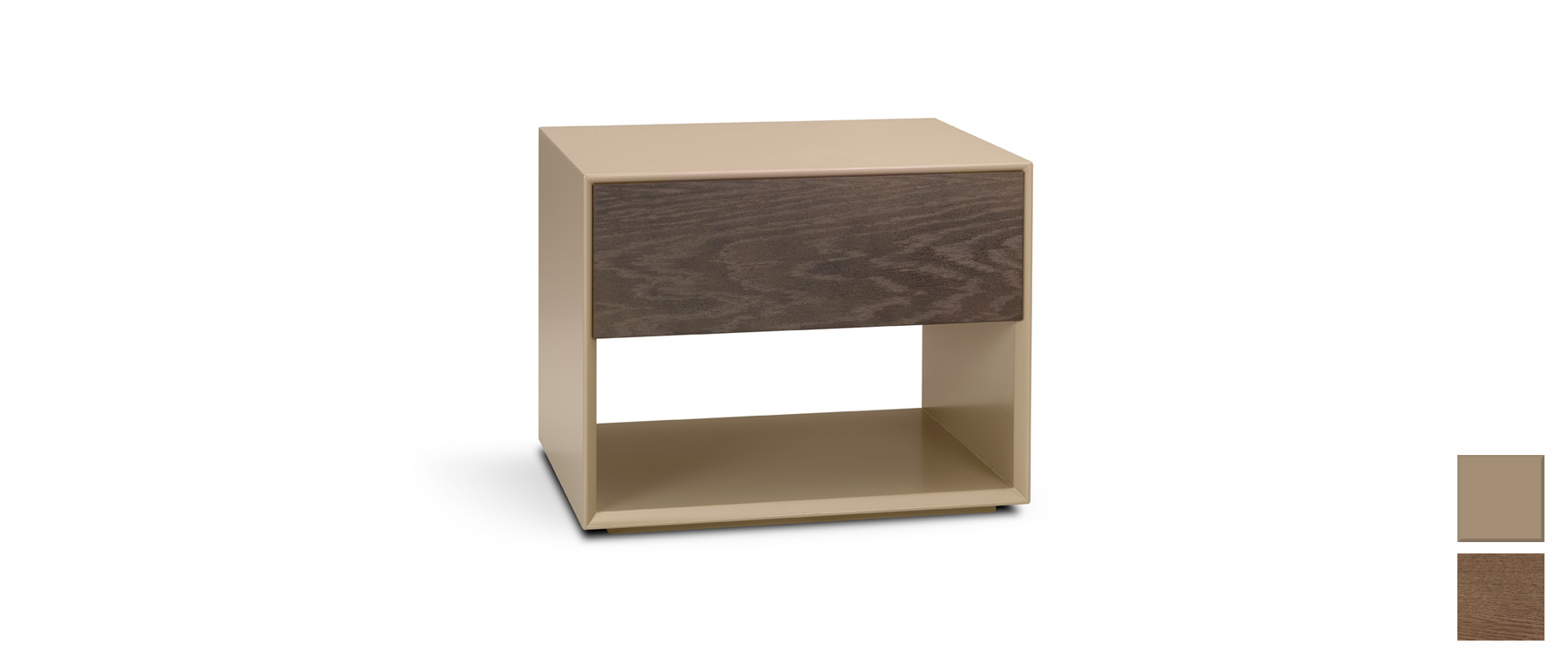 είναι ένα μοντέρνο, λακαριστό κομοδίνο με επιφάνεια (μετώπη) από φυσικό ξύλο καπλαμά που συνδυάζεται εύκολα με κάθε κρεβάτι.