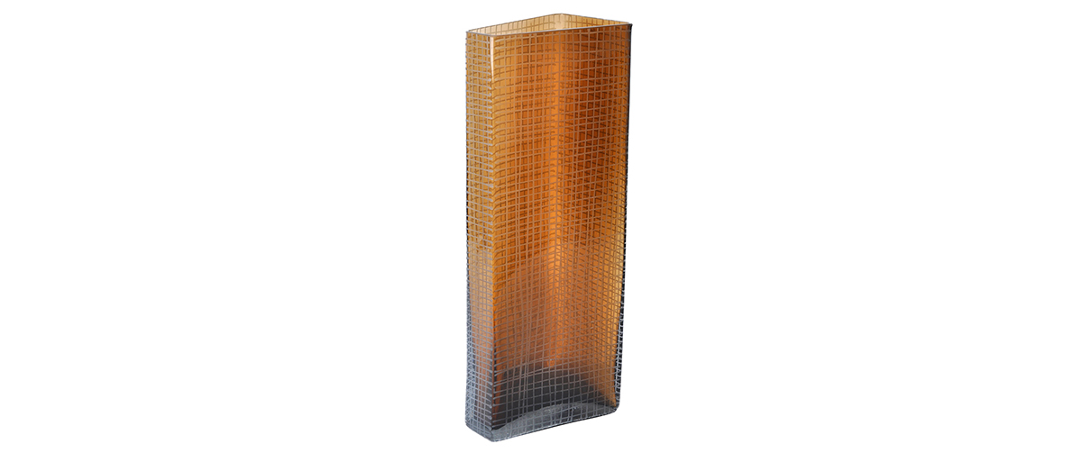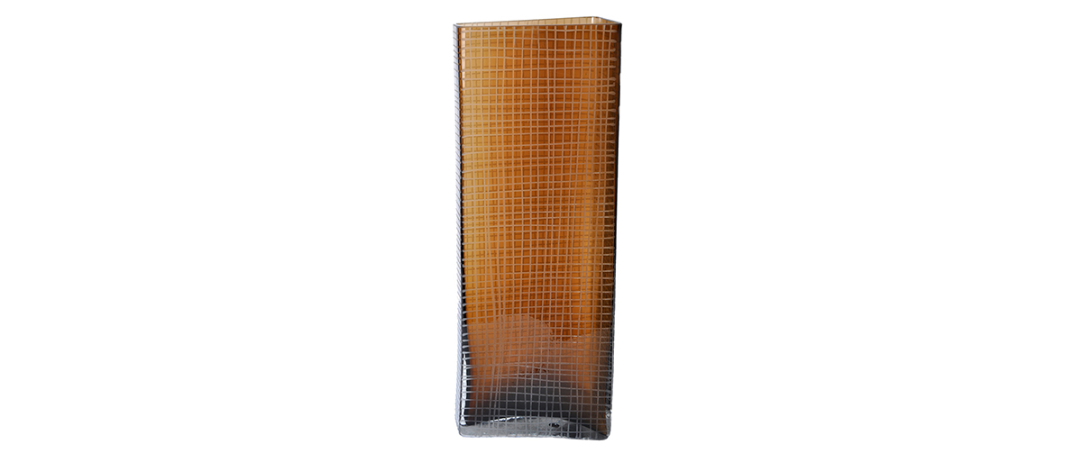 Highlight the geometric elegance and subtle texture of your space with the glass vase Gravir, distinguished by its rectangular shape and a grid pattern created by linear designs.