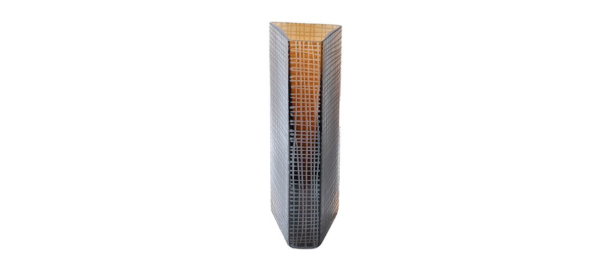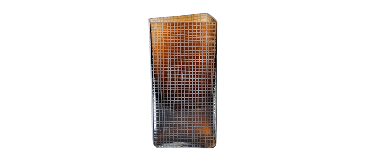 Highlight the geometric elegance and subtle texture of your space with the glass vase Gravir, distinguished by its rectangular shape and a grid pattern created by linear designs.