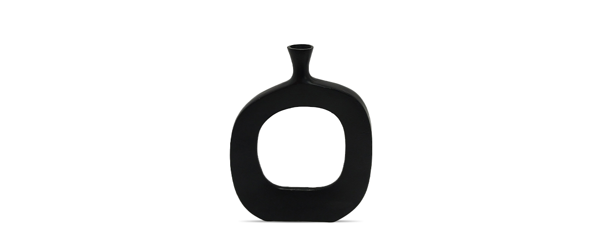 Made from black aluminum, it features rounded curves and a hollow central cavity, creating a sense of lightness and modern design.