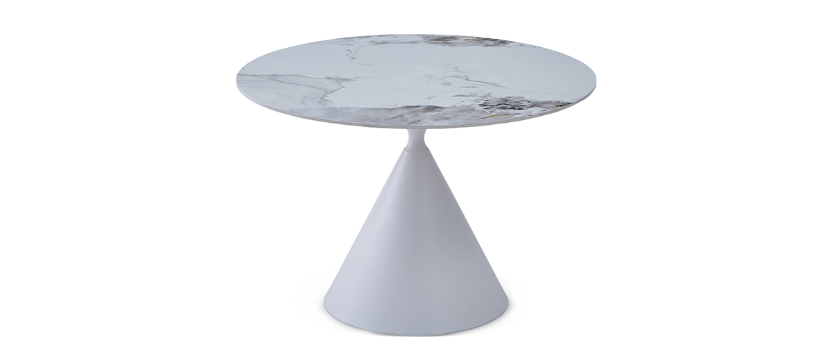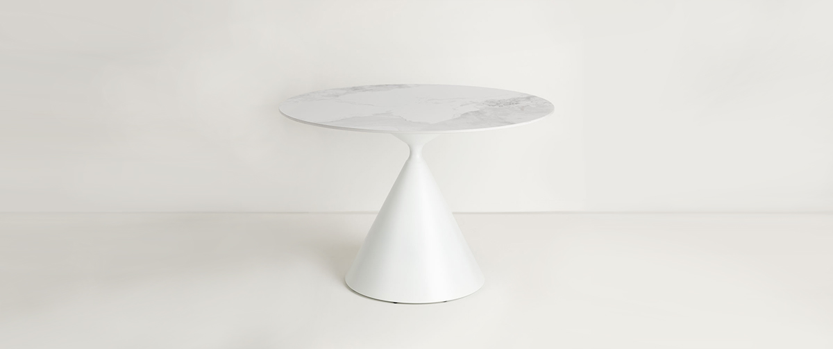 The white metal frame ensures stability and clean lines, highlighting the table’s timeless elegance and minimal design character.