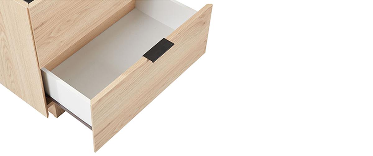 Crafted from melamine in a natural wood finish, it brings warmth and elegance to your space, while the top surface, made of smoked black glass, adds a refined touch of luxury and contemporary design.