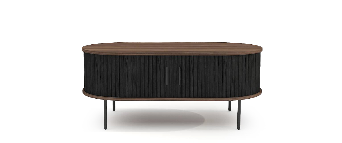 The Harlem coffee table features sliding side drawers, made of durable melamine in walnut color that combines functionality and style.