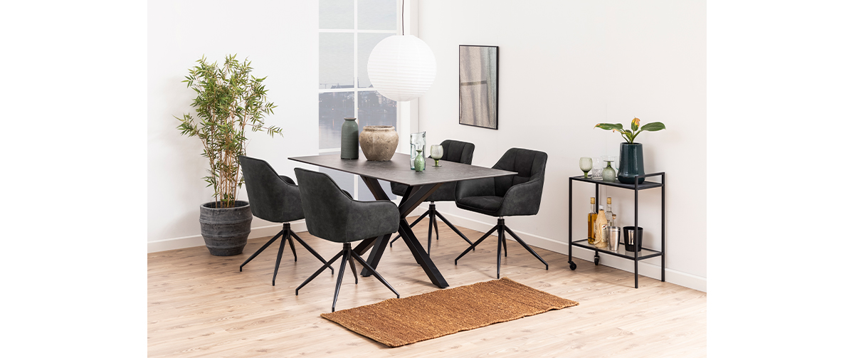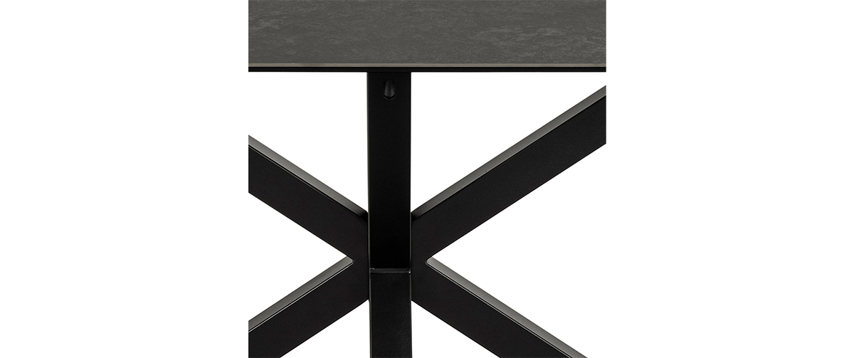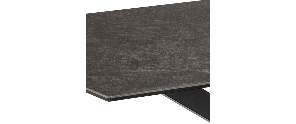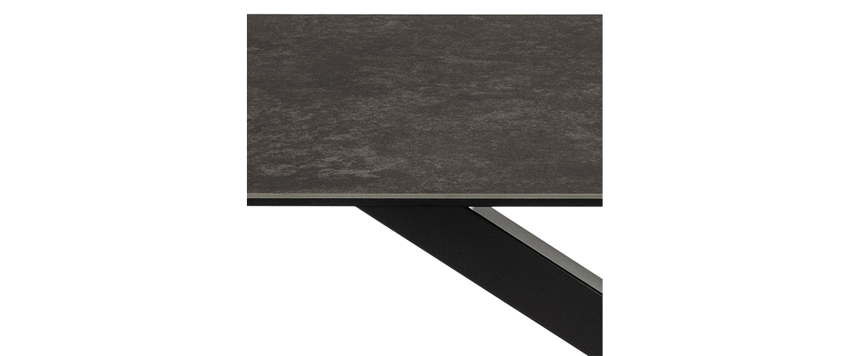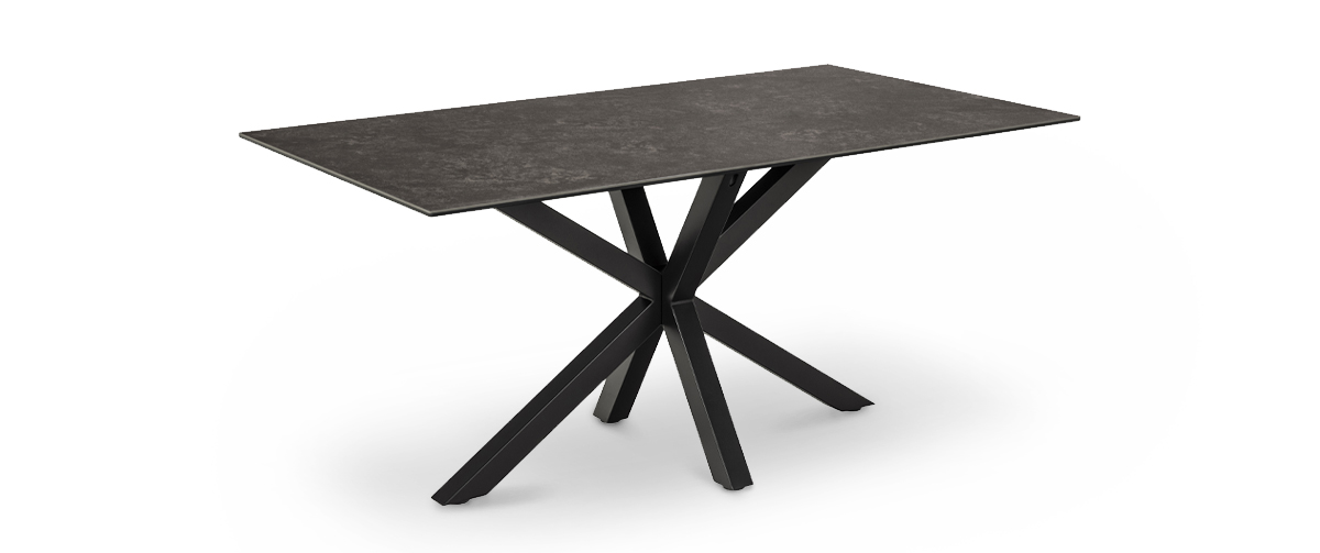 The rectangular Heaven dining table with a rough  ceramic top and a matte black steel base,