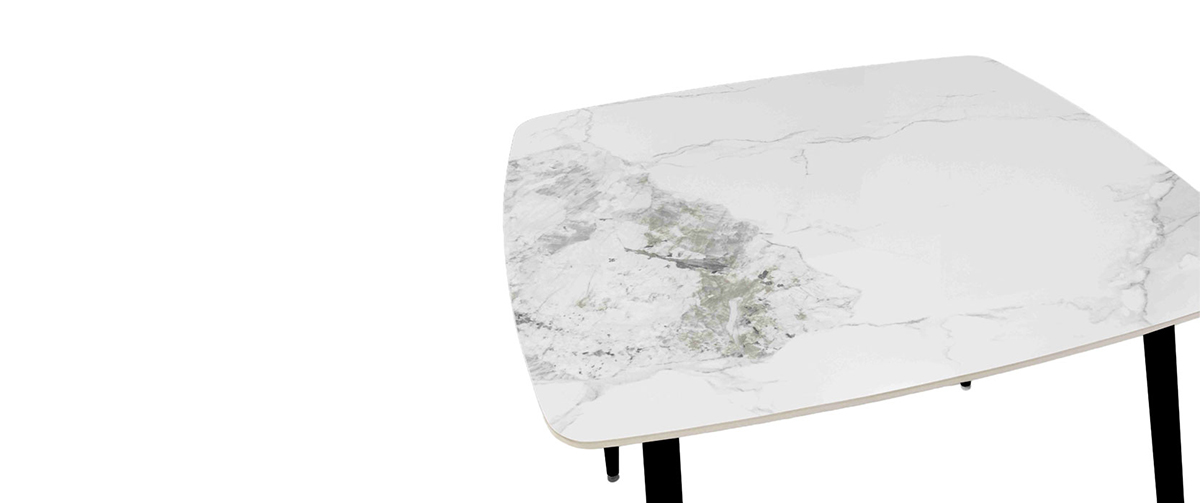 Its 11mm thick ceramic top in a white marble-effect finish offers natural elegance and high resistance to wear, stains, and heat.