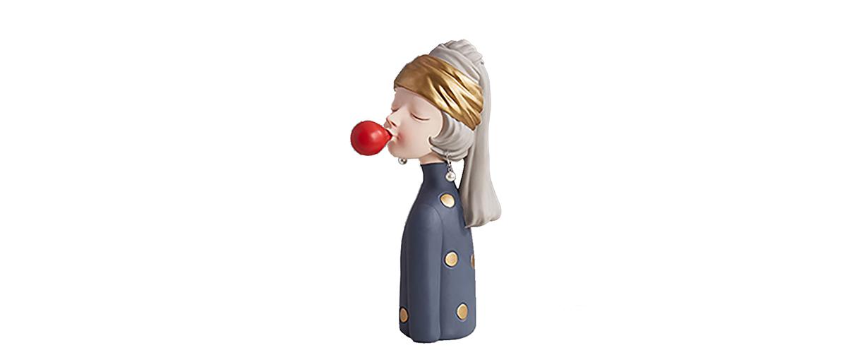 It depicts a girl with a signature ponytail, a ribbon in her hair, and a polka-dot top, blowing a large bubblegum bubble.